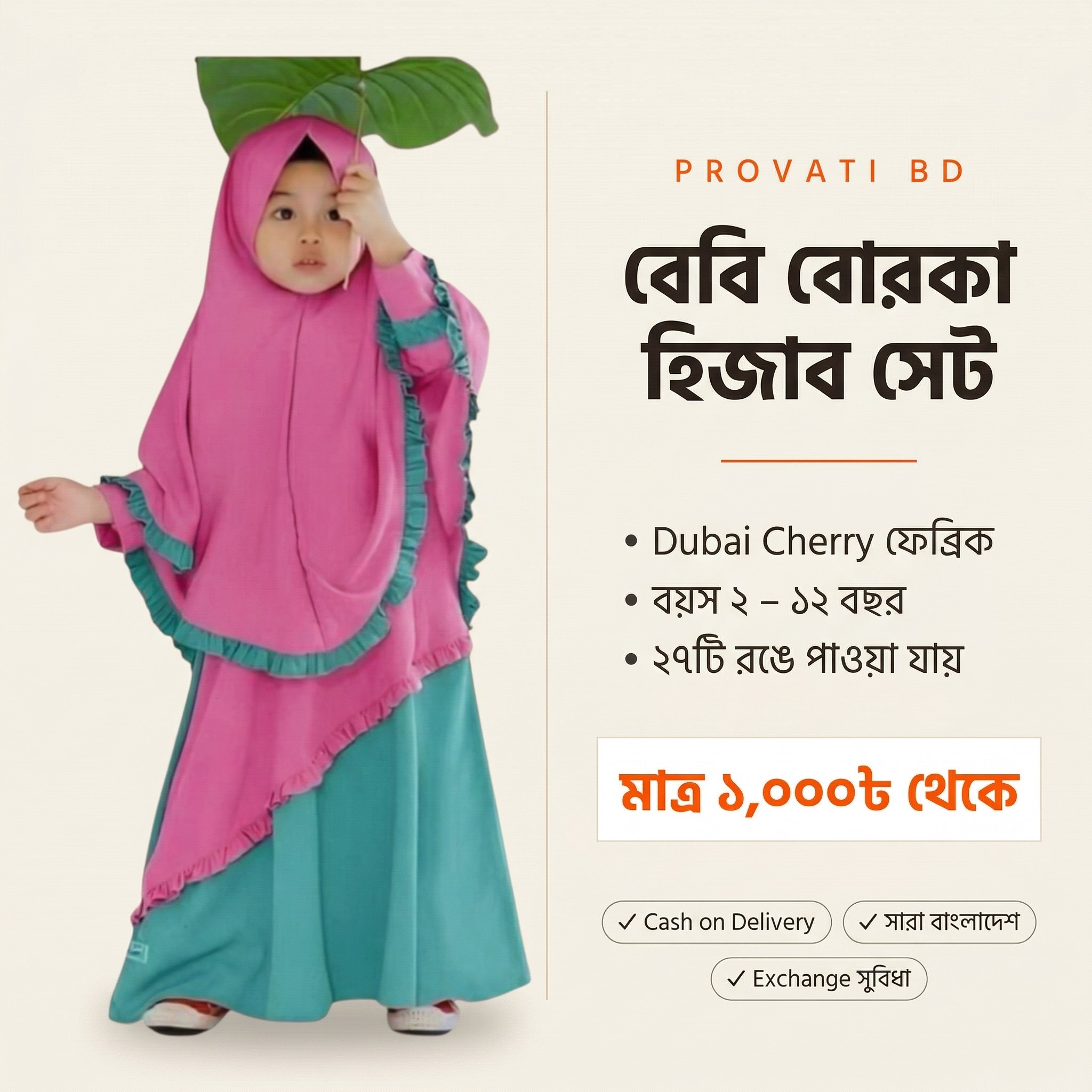 আপনার ছোট্ট মেয়ের জন্য নিয়ে এসেছি Dubai Cherry ফেব্রিকের এক্সক্লুসিভ বেবি বোরকা হিজাব সেট। শালীন, আরামদায়ক এবং দেখতে অপূর্ব সুন্দর — প্রতিটি মায়ের স্বপ্নের পোশাক!